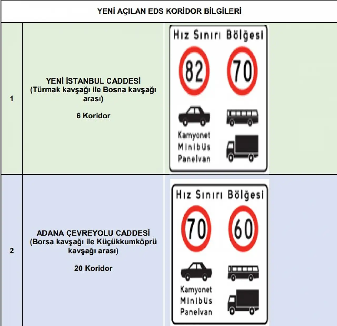 Adana Çevre Yolu Caddesi (Borsa Kavşağı – Küçükkumköprü Kavşağı arası): 20 koridor, otomobiller için 70 km/s, ticari araçlar için 60 km/s hız limiti.