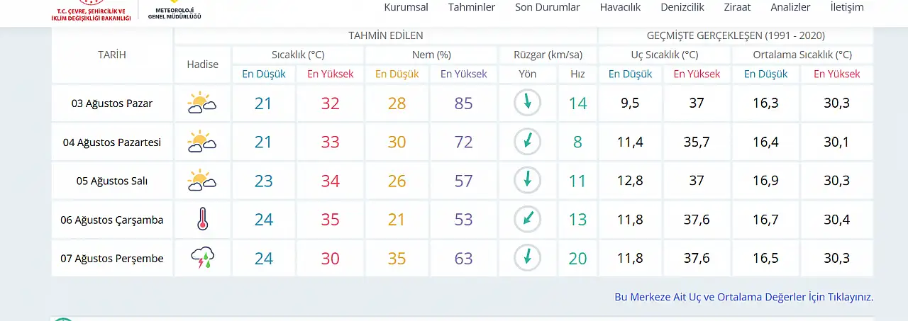 03 Ağustos Pazar: Kent genelinde parçalı bulutlu bir hava hâkim olacak. Gün içinde en düşük sıcaklık 21, en yüksek sıcaklık ise 32 derece olacak.