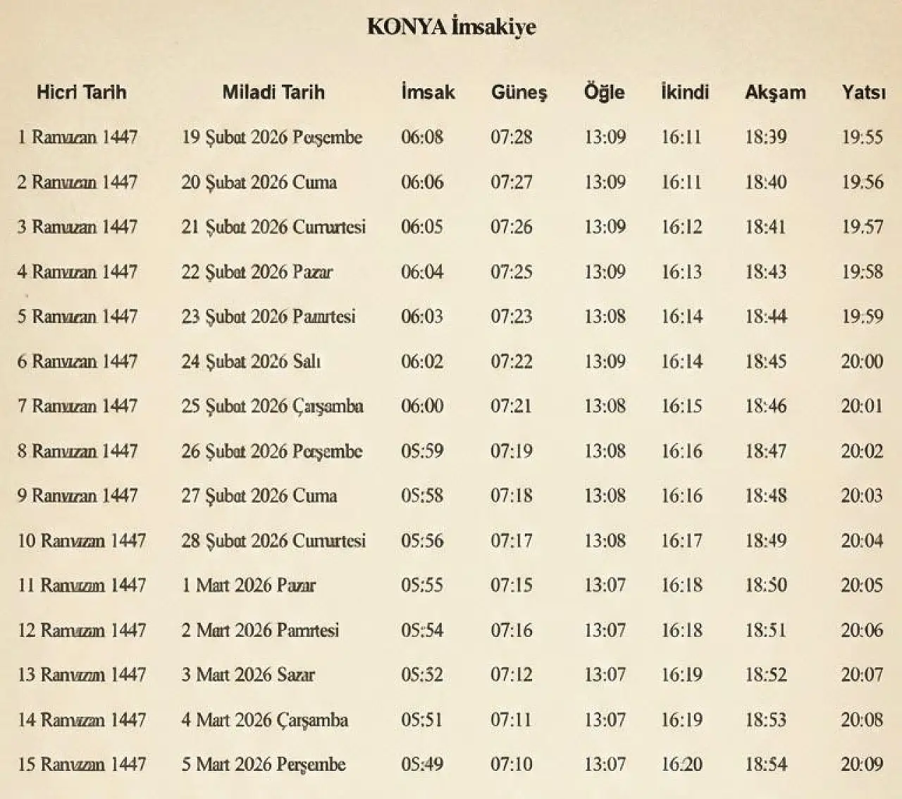 2026 Ramazan ayı 19 Şubat'ta başlıyor. Milyonlarca kişi ilk sahur için 18 Şubat gecesi kalkacak. Konya'da ilk imsak 06.08, ilk iftar 18.39'da. Kentte oruç süresi ilk gün 12 saat 31 dakika olacak.