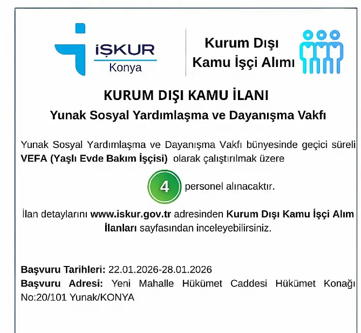 Konya'nın Yunak ve Hadim ilçelerinde VEFA projesi kapsamında Sosyal Yardımlaşma ve Dayanışma Vakıfları bünyesine toplam 6 personel alımı için başvurular başladı.