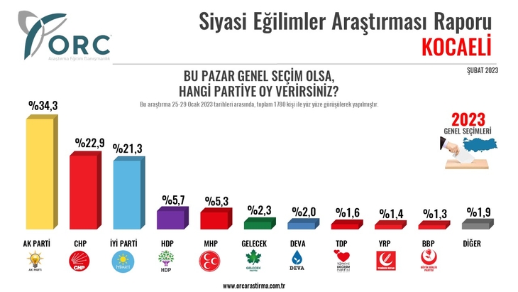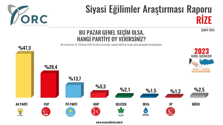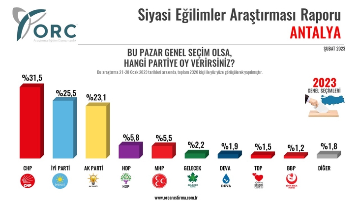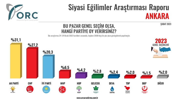 Orc Araştırma Şirketinin 22- 28 Ocak 2023 tarihleri arasında, toplam 2 bin 450 kişi ile yüz yüze gerçekleştirdiği ‘Bu Pazar seçim olsa hangi partiye oy verirsiniz ?’ adlı anket çalışmasında şaşırtan sonuçlar ortaya çıktı.