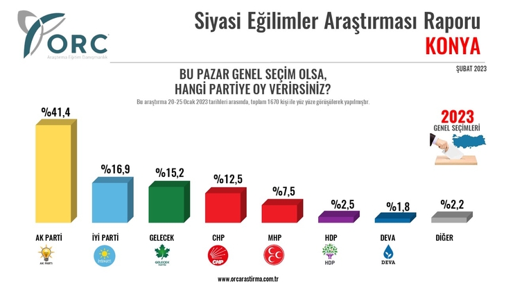ORC Araştırma Şirketinin 'Siyasi Eğilimler' adını verdiği araştırmada Konya, Rize, Antalya, Kocaeli, Ankara, Bursa gibi büyükşehirlerde ittifakların aldığı oy sonuçlarını yayınladı. Konya'daki oy dağılımı dikkat çekti.