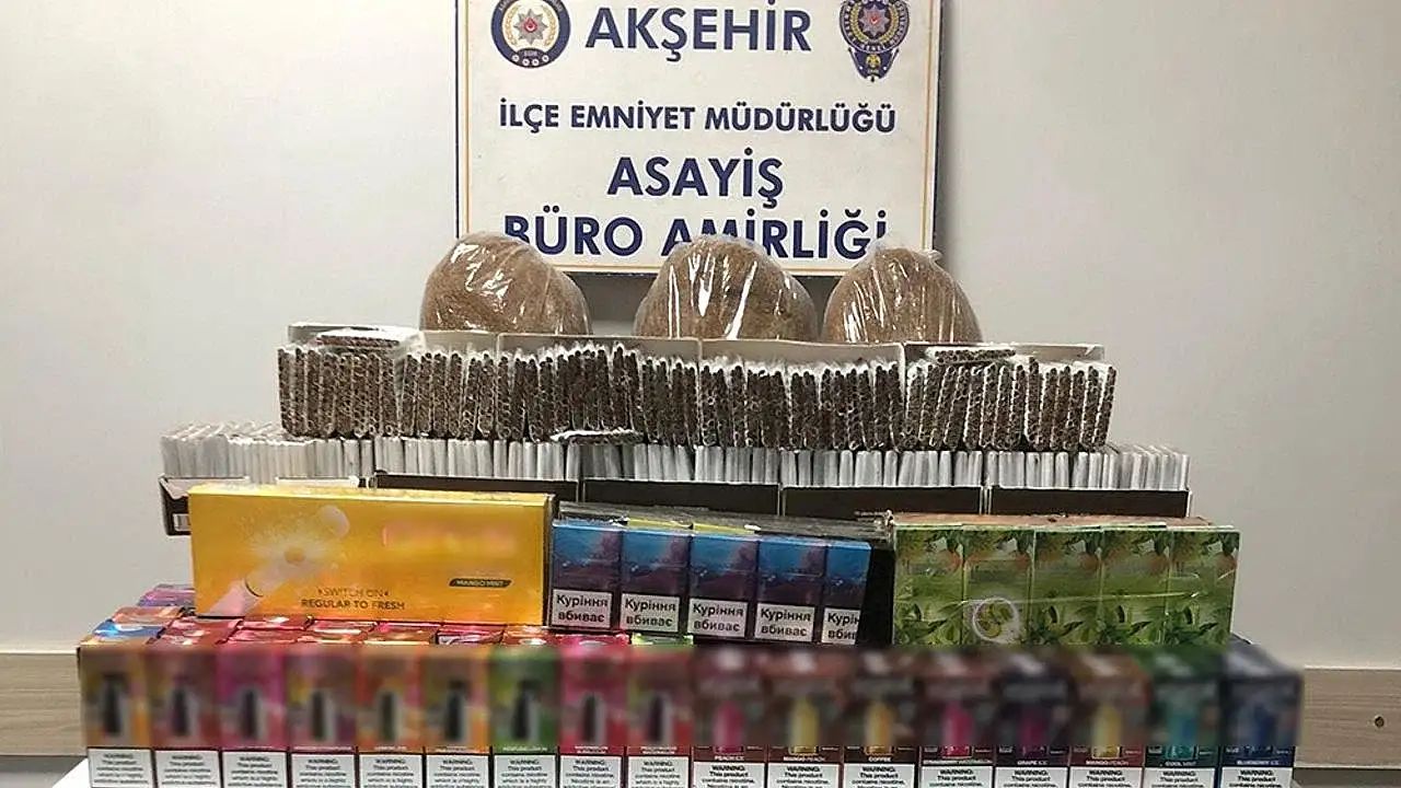 Konya Akşehir'de polis operasyonunda binlerce elektronik sigara, kaçak sigara ve tütün ele geçirildi. Gözaltına alınan iki şüpheli, adli kontrol şartıyla serbest bırakıldı.