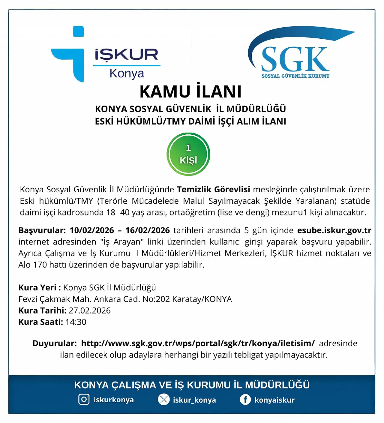 Konya Sosyal Güvenlik İl Müdürlüğü, eski hükümlü ve TMY statüsünde daimi işçi alımı için ilana çıktı.
