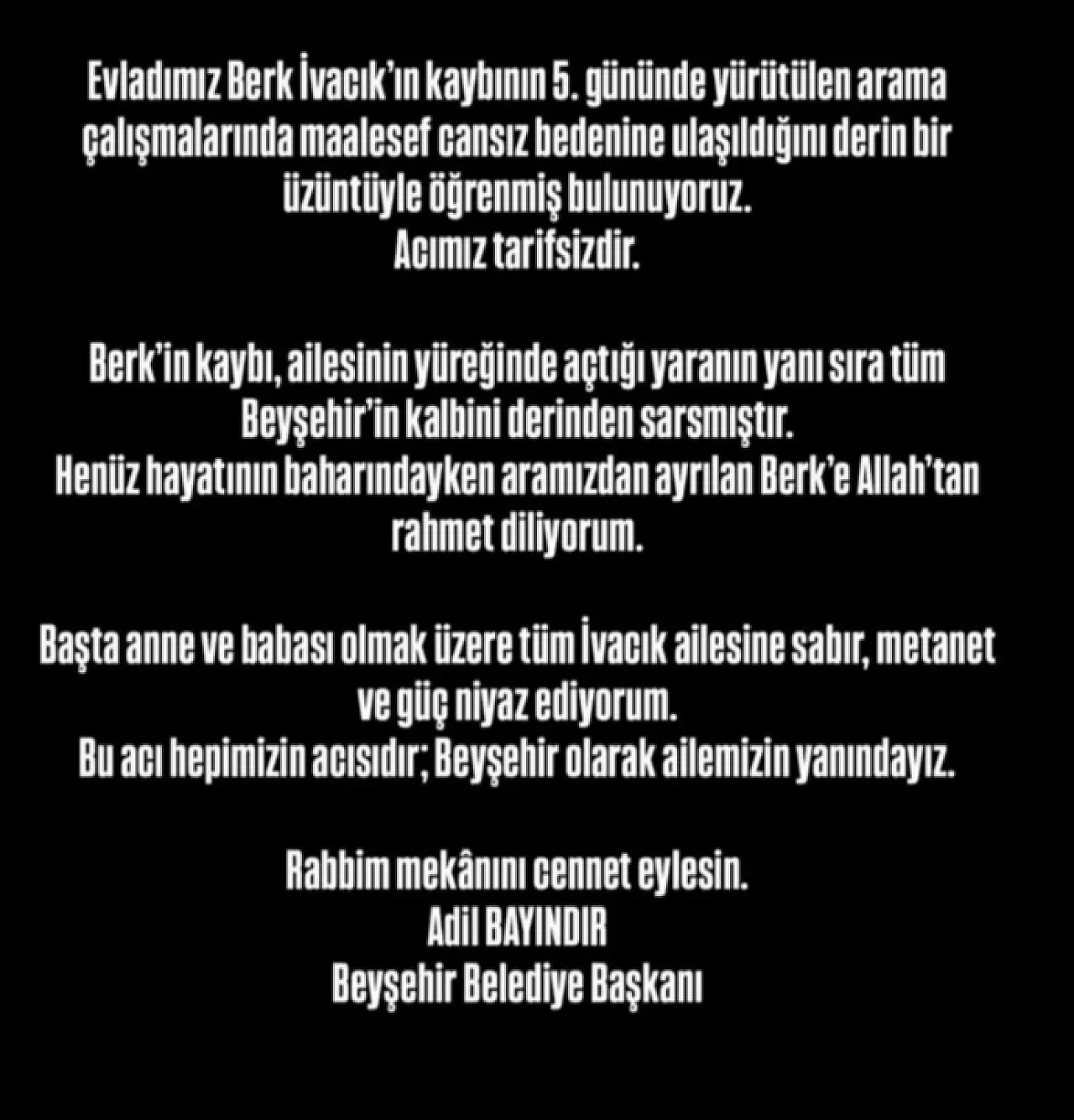 Berkin ölümüne dair paylaşım yapan Beyşehir Belediye Başkanı Adil Bayındır ise, “Evladımız Berk İvacık'ın kaybının 5. gününde yürütülen arama çalışmalarında maalesef cansız bedenine ulaşıldığını derin bir üzüntüyle öğrenmiş bulunuyoruz. Acımız tarifsizdir.