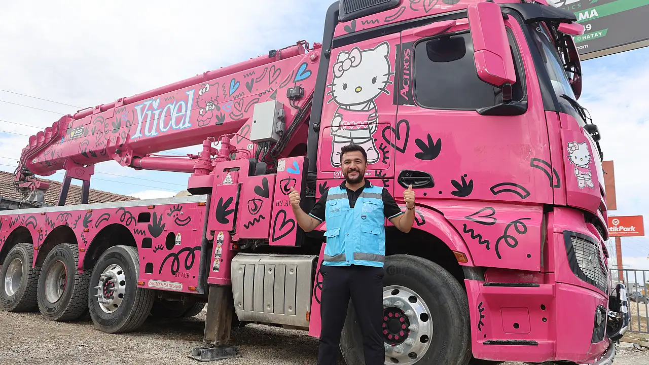 Hatay'da vinç sektöründe hizmet veren Kamil Yücel, kızının ‘Baba bizim neden pembe vincimiz yok, bizim de pembe vincimiz olsun' sözlerinden ilham alarak tasarladıkları; pembe, mor, siyah ve gri vinçlerle inşaat sektörüne renk katıyor.