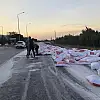 Konya'nın Akşehir ilçesi yakınlarında un yüklü bir tırın lastiğinin patlaması sonucu araç kontrolden çıktı. Meydana gelen kazada, dorsedeki un çuvalları yola savruldu.