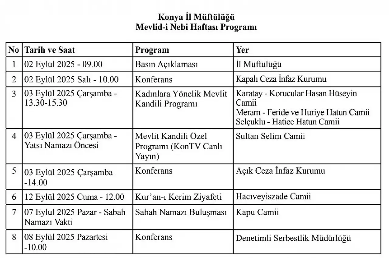 Mevlit Kandili 3 Eylül Çarşamba günü Konya'da camilerde Kur'an tilavetleri, mevlit programları ve dualarla idrak edilecek. İl Müftülüğü, tüm Konyalıları hafta boyunca düzenlenecek etkinliklere davet etti.