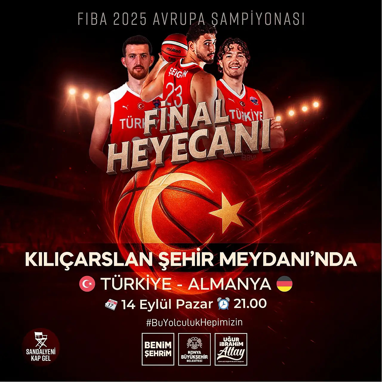 A Milli Erkek Basketbol Takımı’nın EuroBasket 2025’teki tarihi final mücadelesi, Konya’da binlerce basketbolseveri aynı noktada buluşturacak. Almanya karşısına çıkacak millilerin heyecanla beklenen karşılaşması, 14 Eylül Pazar günü saat 21.00’de Kılıçarslan Şehir Meydanı’nda dev ekrandan canlı yayınlanacak.