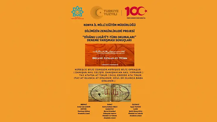 Milli Eğitim Bakanlığınca bu yıl uygulamaya başlanılan Dilimizin Zenginlikleri Projesi kapsamında İl Milli Eğitim Müdürlüğü koordinesinde gerçekleştirilen “Dîvânu Lugâti't-Türk Okumaları Deneme Yazma Yarışması” sonuçlandı.