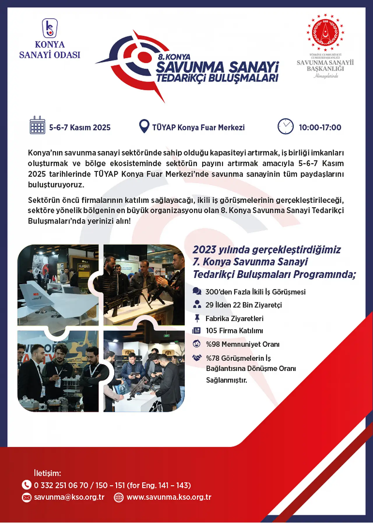 2023 yılında düzenlenen 7. Konya Savunma Sanayi Tedarikçi Buluşmaları, büyük bir başarıyla tamamlanmıştı. 29 ilden yaklaşık 22 bin ziyaretçi etkinliğe katılırken, 105 firma 300’den fazla ikili iş görüşmesi gerçekleştirdi. Katılımcıların yüzde 98’i etkinlikten memnun kalırken, yüzde 78’lik görüşme oranı yeni iş bağlantılarına dönüştü.