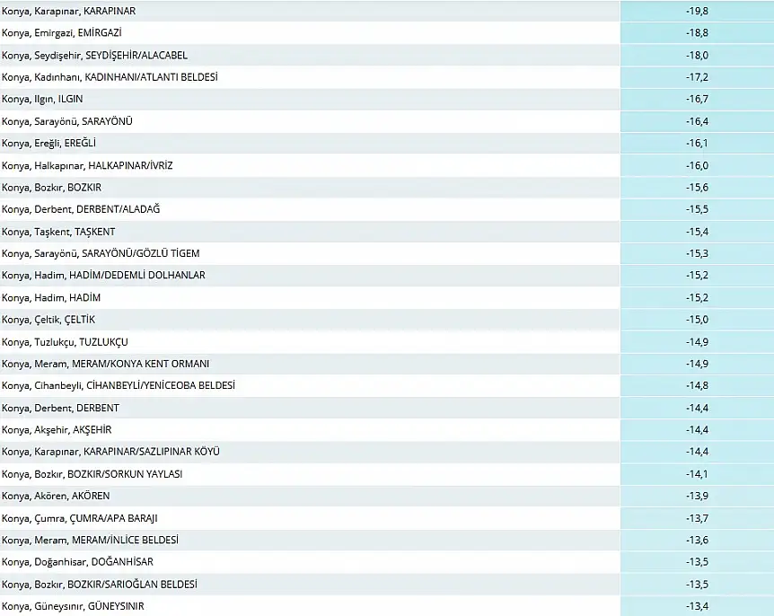 Meteoroloji verilerine göre Konya genelinde en düşük sıcaklık eksi 19,8 derece ile Karapınar ilçesinde kaydedildi. Karapınar’ı eksi 18,8 derece ile Emirgazi ve eksi 18 derece ile Seydişehir (Alacabel) takip etti. Bu değerler, bölgenin son yıllardaki en soğuk ölçümleri arasında yer aldı.