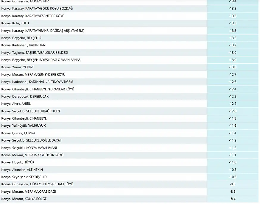 Konya genelindeki ölçüm istasyonlarından alınan verilere göre öne çıkan bazı ilçelerde kaydedilen en düşük sıcaklıklar şöyle: