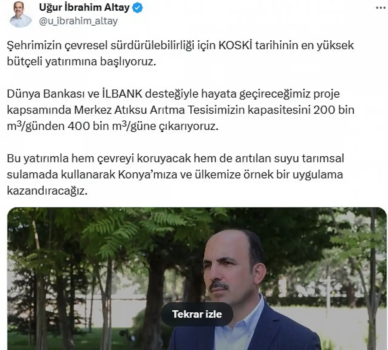 Başkan Altay bu yatırımın Türkiye'ye de örnek olacağını ifade ederek, “Dünya Bankası ve İLBANK desteğiyle hayata geçireceğimiz proje kapsamında Merkez Atıksu Arıtma Tesisimizin kapasitesini 200 bin m³/günden 400 bin m³/güne çıkarıyoruz. Bu yatırımla hem çevreyi koruyacak hem de arıtılan suyu tarımsal sulamada kullanarak Konya’mıza ve ülkemize örnek bir uygulama kazandıracağız.” şeklinde konuştu.