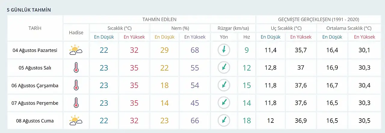 Haftanın ilk ve son günlerinde hava kısmen bulutlu olacak, diğer günler ise güneş şehre hakim olacak. Salı, Çarşamba ve Perşembe günleri termometrelerin 35 dereceyi göstermesi bekleniyor.