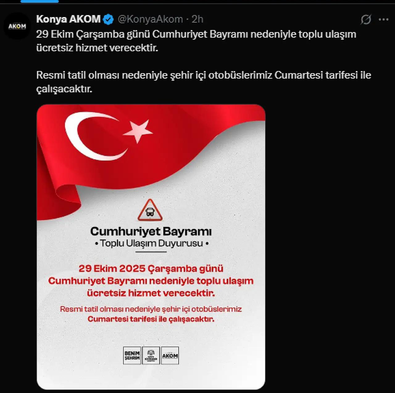Konya Büyükşehir Belediyesi Afet Koordinasyon Merkezi (AKOM), Cumhuriyet Bayramı’na özel ulaşım düzenlemesini duyurdu. Yapılan açıklamaya göre, 29 Ekim Çarşamba günü şehir içi toplu ulaşım araçları vatandaşlara gün boyu ücretsiz hizmet verecek.