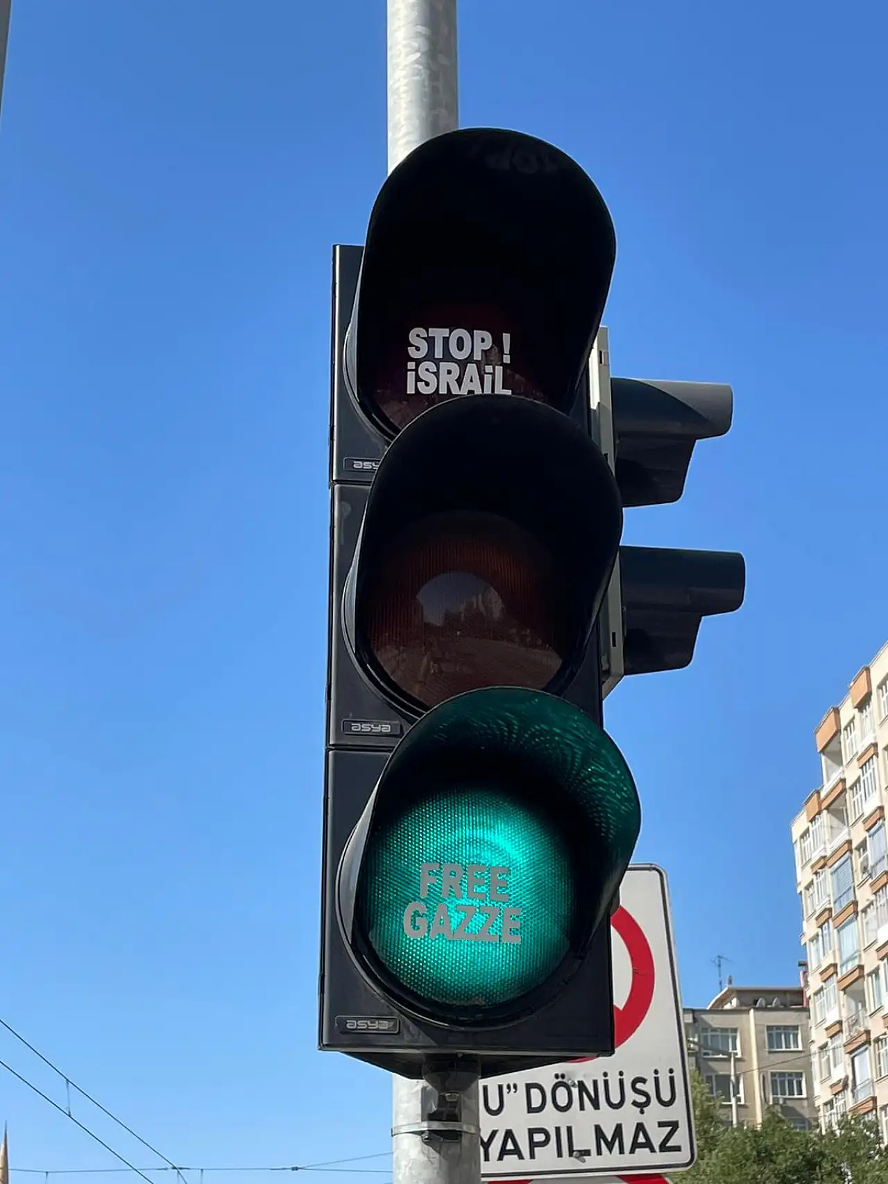Şehir merkezinde kaydedilen görüntüler, vatandaşların dikkatini çekti. Sürücüler ve yayalar, trafik ışıklarında yazılı mesajlarla İsrail’in Gazze’ye yönelik saldırılarına karşı tepkinin dile getirildiğini gördü.