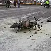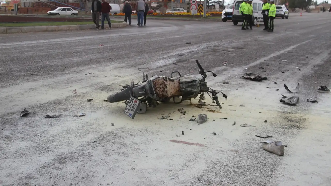 Konya'nın Beyşehir ilçesinde işçi servisi ile çarpışarak alev alan motosikletteki 2 kişi yaralandı.