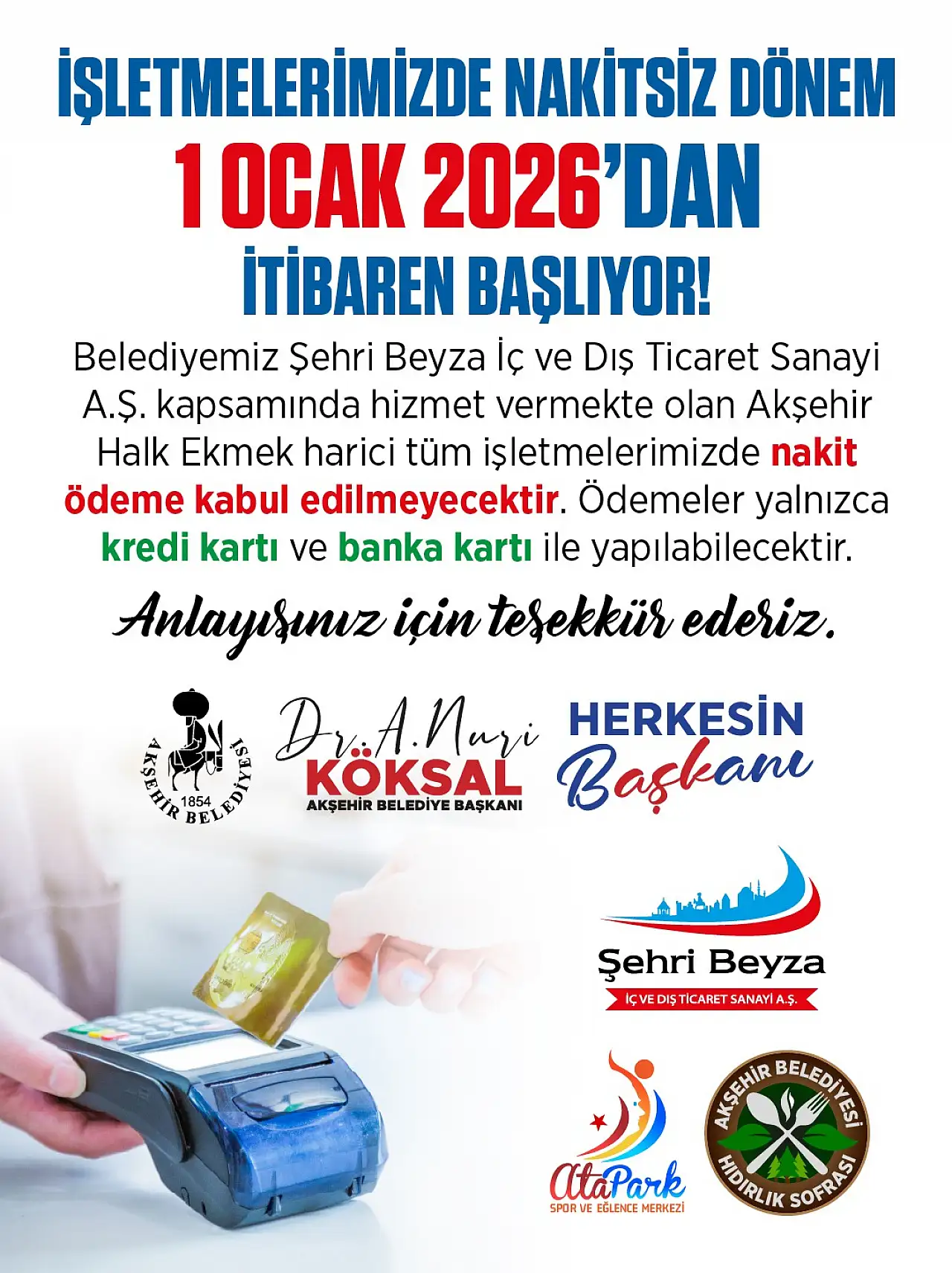 "Belediyemiz bünyesinde faaliyet gösteren Şehri Beyza A.Ş. kapsamındaki işletmelerimizde, 1 Ocak 2026 tarihinden itibaren Akşehir Halk Ekmek dışında nakit ödeme alınmayacaktır. Ödemeler banka kartı ve kredi kartı ile gerçekleştirilecektir."