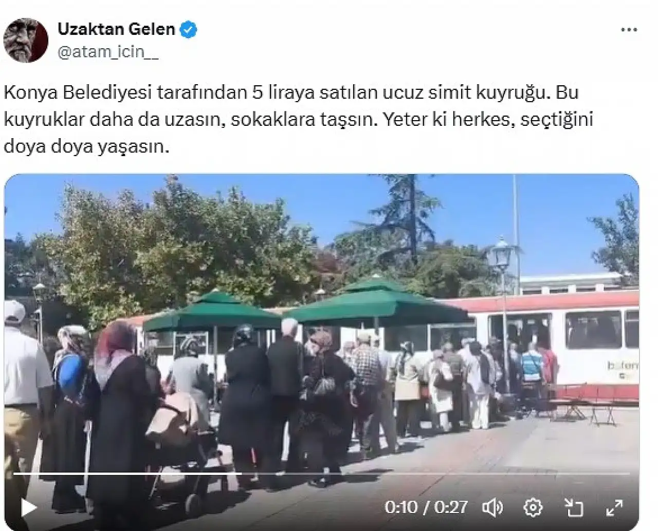 “Konya Belediyesi tarafından 5 liraya satılan ucuz simit kuyruğu. Bu kuyruklar daha da uzasın, sokaklara taşsın. Yeter ki herkes, seçtiğini doya doya yaşasın.”