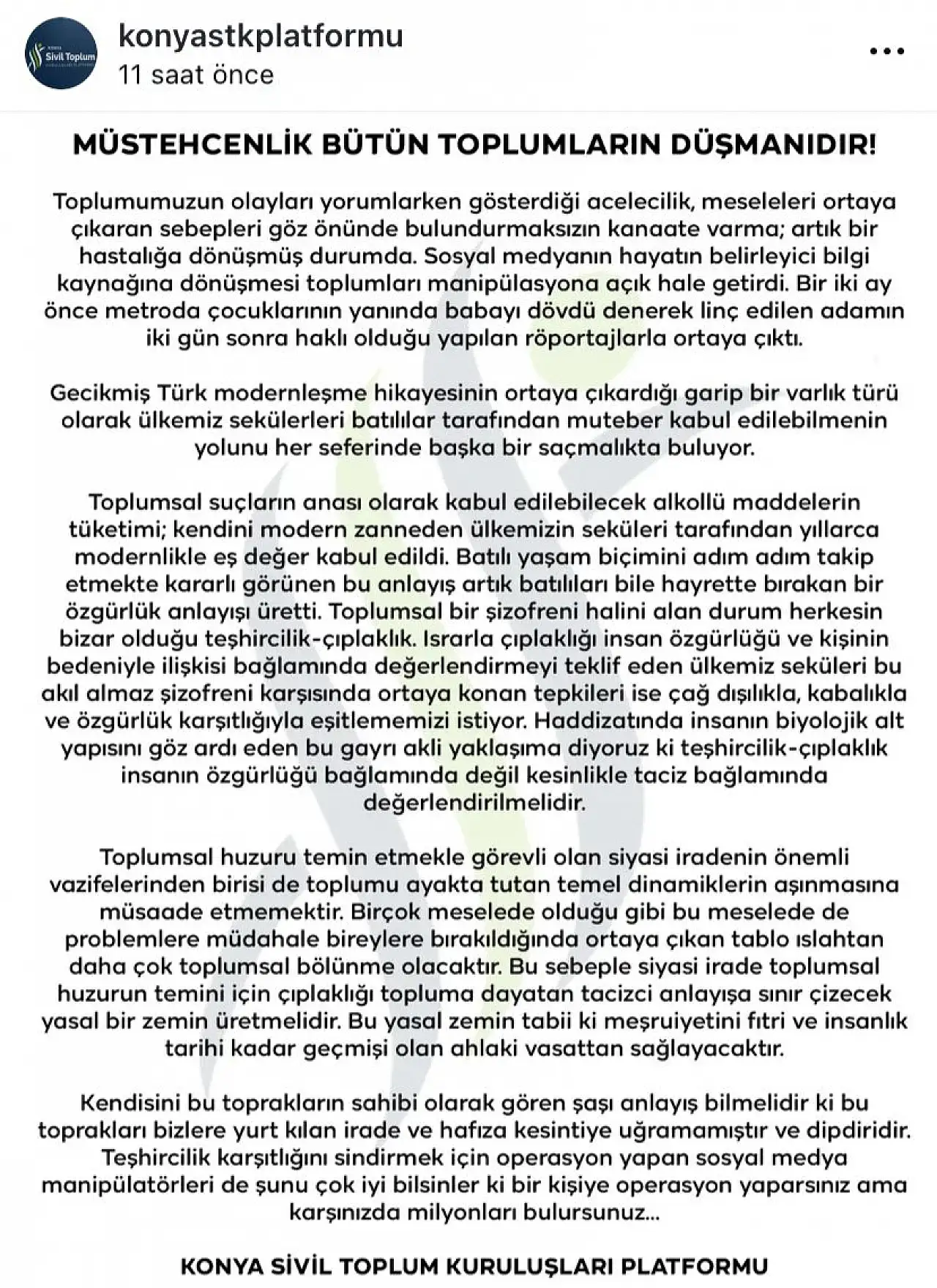 Olayın gündemdeki yankıları devam ederken, Konya Sivil Toplum Kuruluşları Platformu da bir açıklama yayımladı. Platform, olayın sosyal medyada hızla yayılarak toplumsal kutuplaşmaya dönüştürüldüğünü savundu. Açıklamada, müstehcenliğin bireysel özgürlükle değil “toplumsal huzuru bozan bir taciz unsuru” olarak değerlendirilmesi gerektiği vurgulandı.