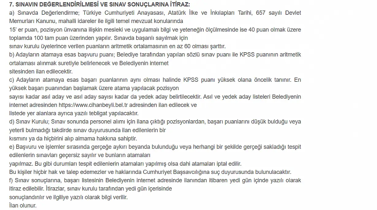 f) Sınav sonuçlarına, başarı listesinin Belediyenin internet adresinde ilanından itibaren yedi gün içinde yazılı olarak itiraz edilebilir. İtirazlar, sınav kurulu tarafından yedi gün içerisinde sonuçlandırılır ve ilgiliye yazılı olarak bilgi verilir.