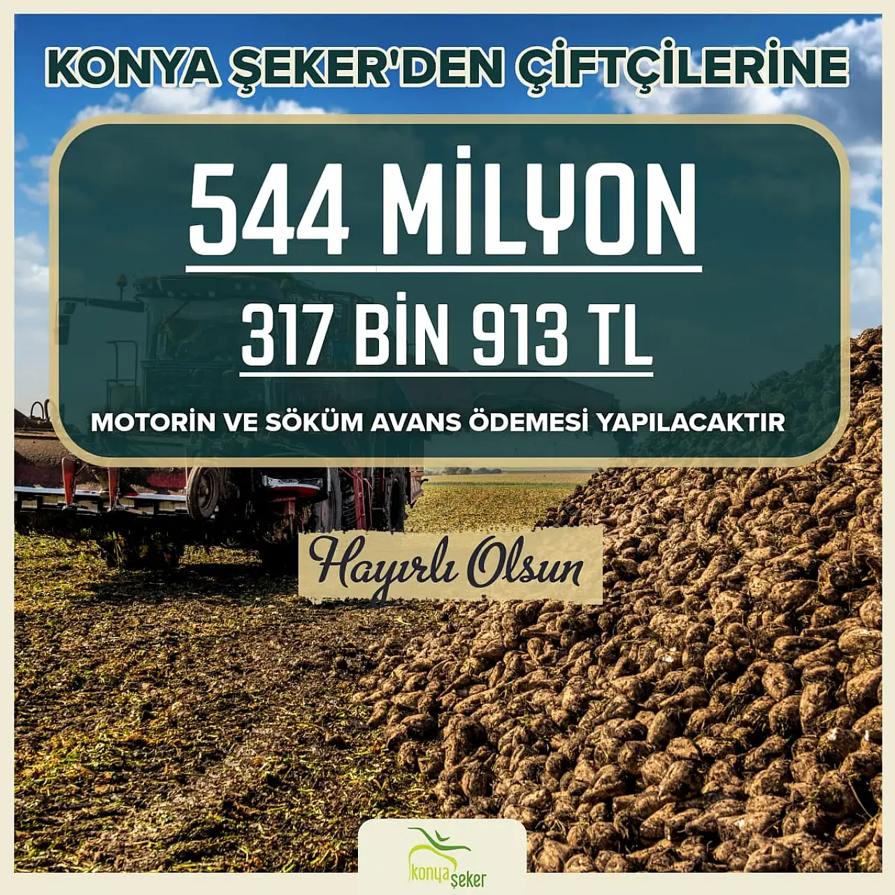 “2025-2026 kampanya döneminde üretici ortaklarımıza 377 milyon 196 bin 250 lira söküm avans desteğinin yanında, 167 milyon 121 bin 663 lira motorin avansı ile toplamda 544 milyon 317 bin lira avans ödemesi yapıyoruz. 8 Ekim 2025 saat 17.00 itibariyle çiftçilerimizin hesaplarına yatırmaya başlayacağımız ödemelerin şimdiden tüm üreticilerimize hayırlı olmasını diliyor, bereketli bir sezon geçirmelerini temenni ediyorum.”