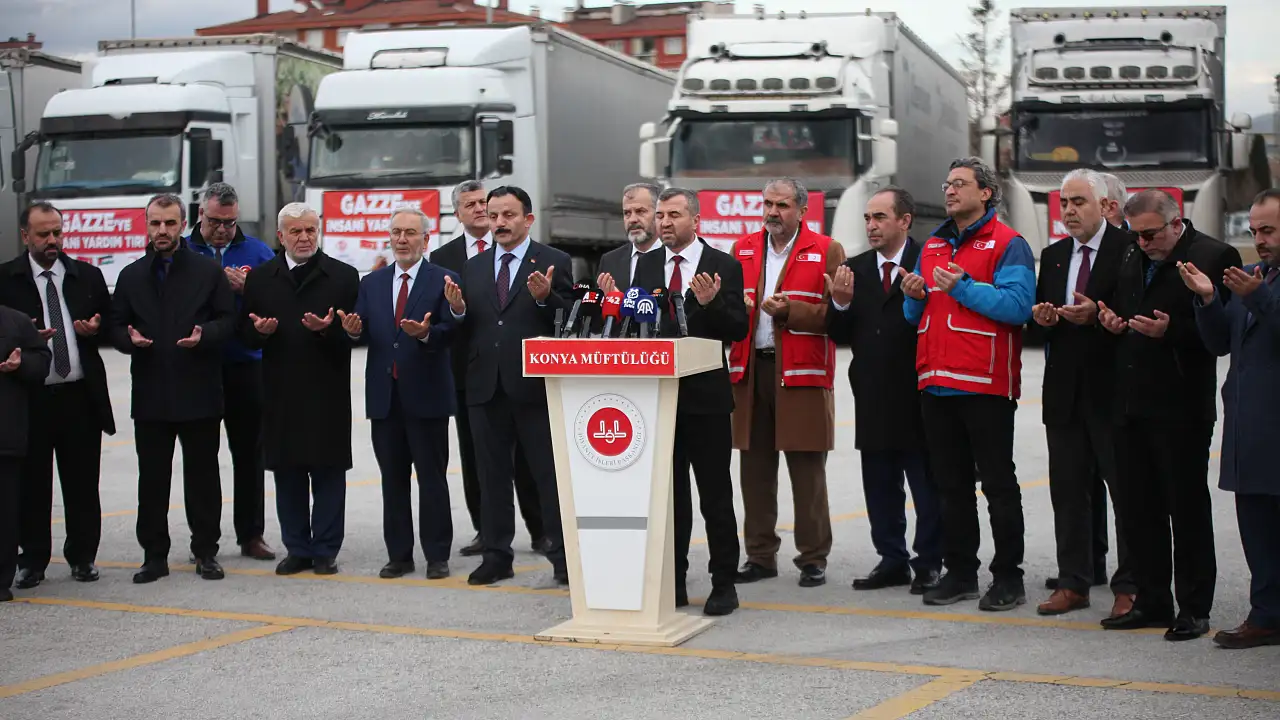 Konya İl Müftülüğü ve Türkiye Diyanet Vakfı Konya Şubesi tarafından hazırlanan yardım tırlarının uğurlanması programı Panorama Müzesi Parkında gerçekleştirildi. Konya'dan yola çıkan un, gıda kolisi, muhtelif kıyafet ve battaniyeden oluşan insani yardım malzemeleri Mersin Limanından pazar günü kalkacak olan 21. Gazze Yardım Gemisi'ne ulaştırılacak. Uğurlama programında konuşan Konya İl Müftüsü Prof. Dr. Ali Öge, "7 Ekim 2023 tarihinden bu yana Filistin hesabımızda toplanan 35 milyon 140 bin TL tutarındaki bağış, Türkiye Diyanet Vakfı Genel Merkezimize aktarılmış olup Gazze'ye yönelik insani yardım çalışmalarımız aralıksız ve yoğun bir şekilde devam etmektedir.