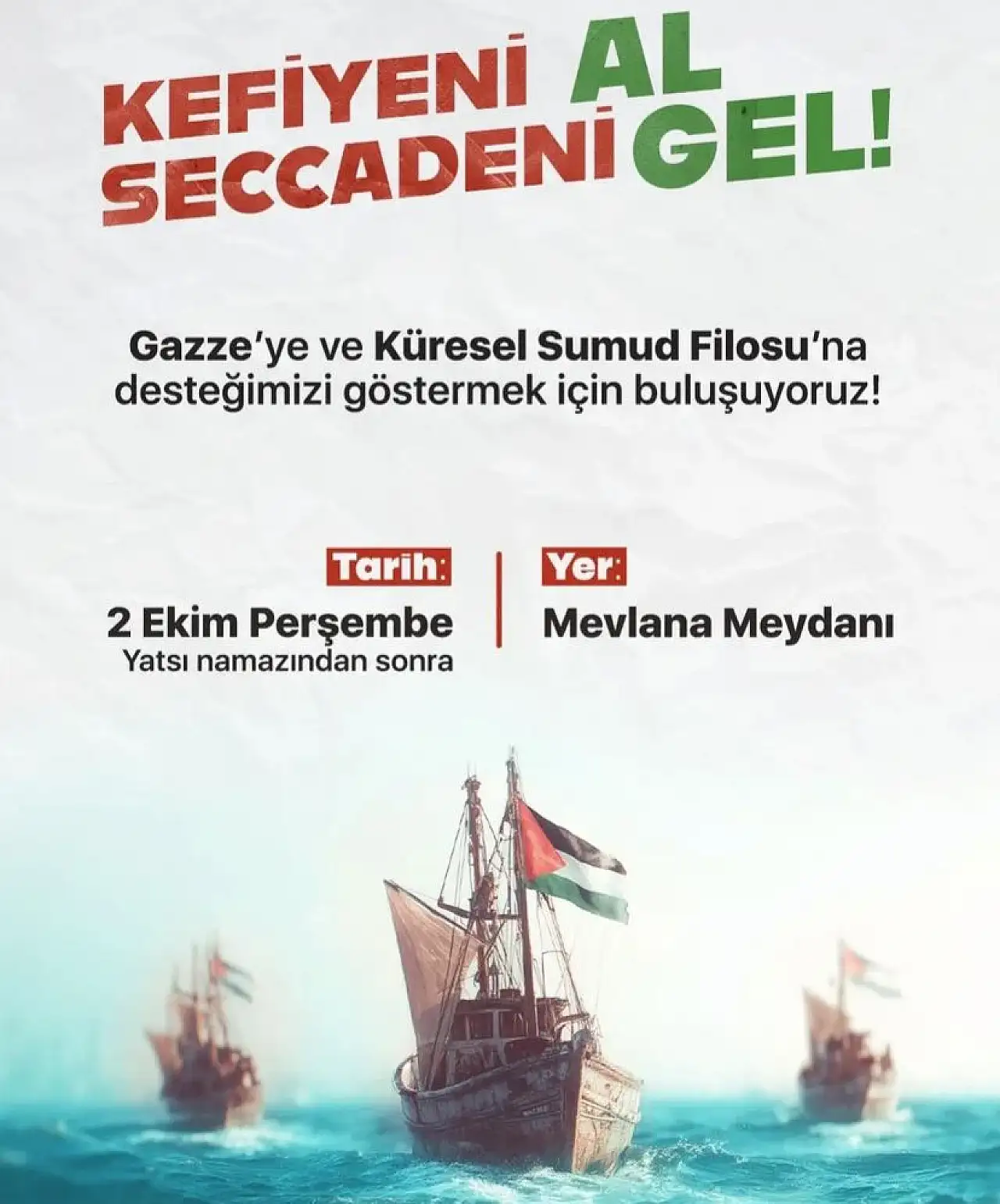 Konya Sivil Toplum Platformu, Gazze’ye ve Küresel Sumud Filosu’na destek için 2 Ekim Perşembe akşamı (bu akşam) Mevlana Meydanı’nda buluşma çağrısı yaptı. “Kefiyeni ve Seccadeni Al Gel” sloganıyla gerçekleştirilecek etkinlik yatsı namazının ardından başlayacak.