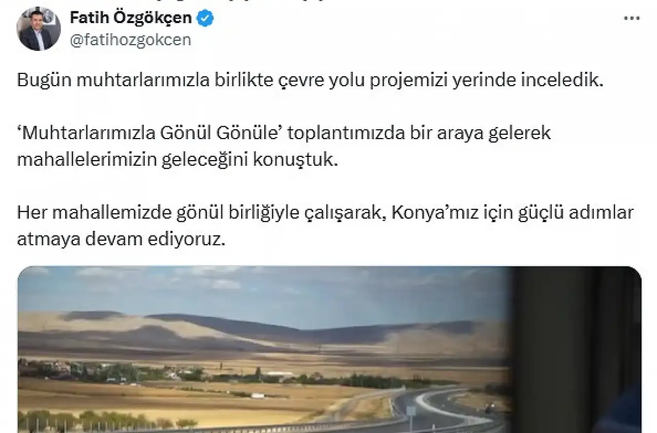 Başkan Özgekçen sosyal medya hesabından yaptıı paylaşımda, “Bugün muhtarlarımızla birlikte çevre yolu projemizi yerinde inceledik. ‘Muhtarlarımızla Gönül Gönüle’ toplantımızda bir araya gelerek mahallelerimizin geleceğini konuştuk. Her mahallemizde gönül birliğiyle çalışarak, Konya’mız için güçlü adımlar atmaya devam ediyoruz” ifadelerine yer verdi.