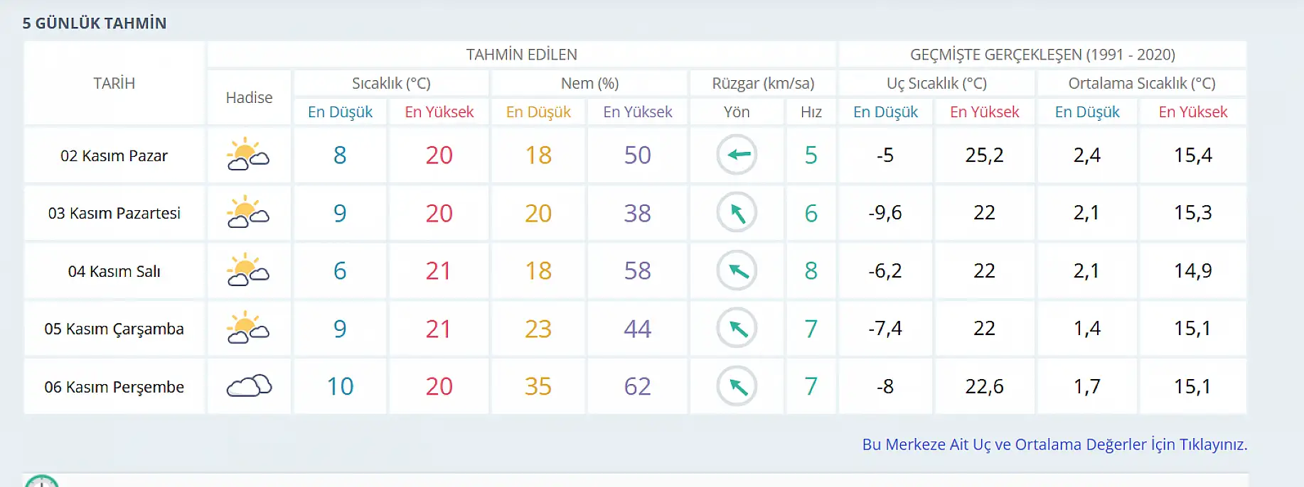 Konya için güncel hava durumu verilerini paylaşan Meteoroloji 8. Bölge Müdürlüğü, 6 Kasım Perşembe gününe kadar hava sıcaklığının en yüksek 20 derecelerde olacağını aktardı.