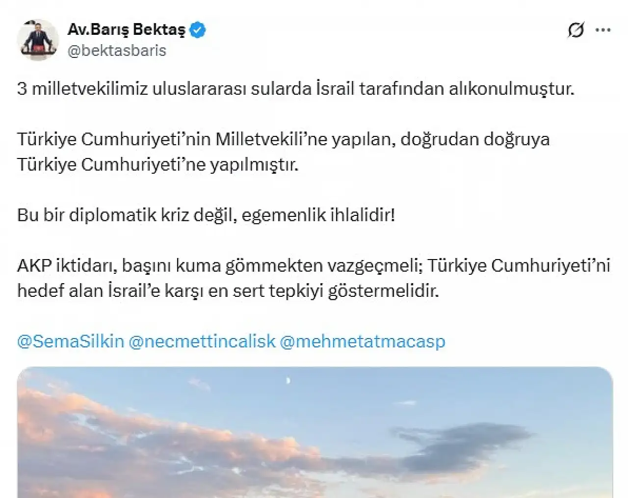 Sumud Filosu Vicdan Gemisi'nde üç milletvekilinin alıkonulmasına karşı tepkisini gösteren CHP Konya Milletvekili Barış Bektaş, "Bu doğrudan Türkiye Cumhuriyetine yapılmıştır, kafanızı kuma gömmekten vazgeçin" dedi.