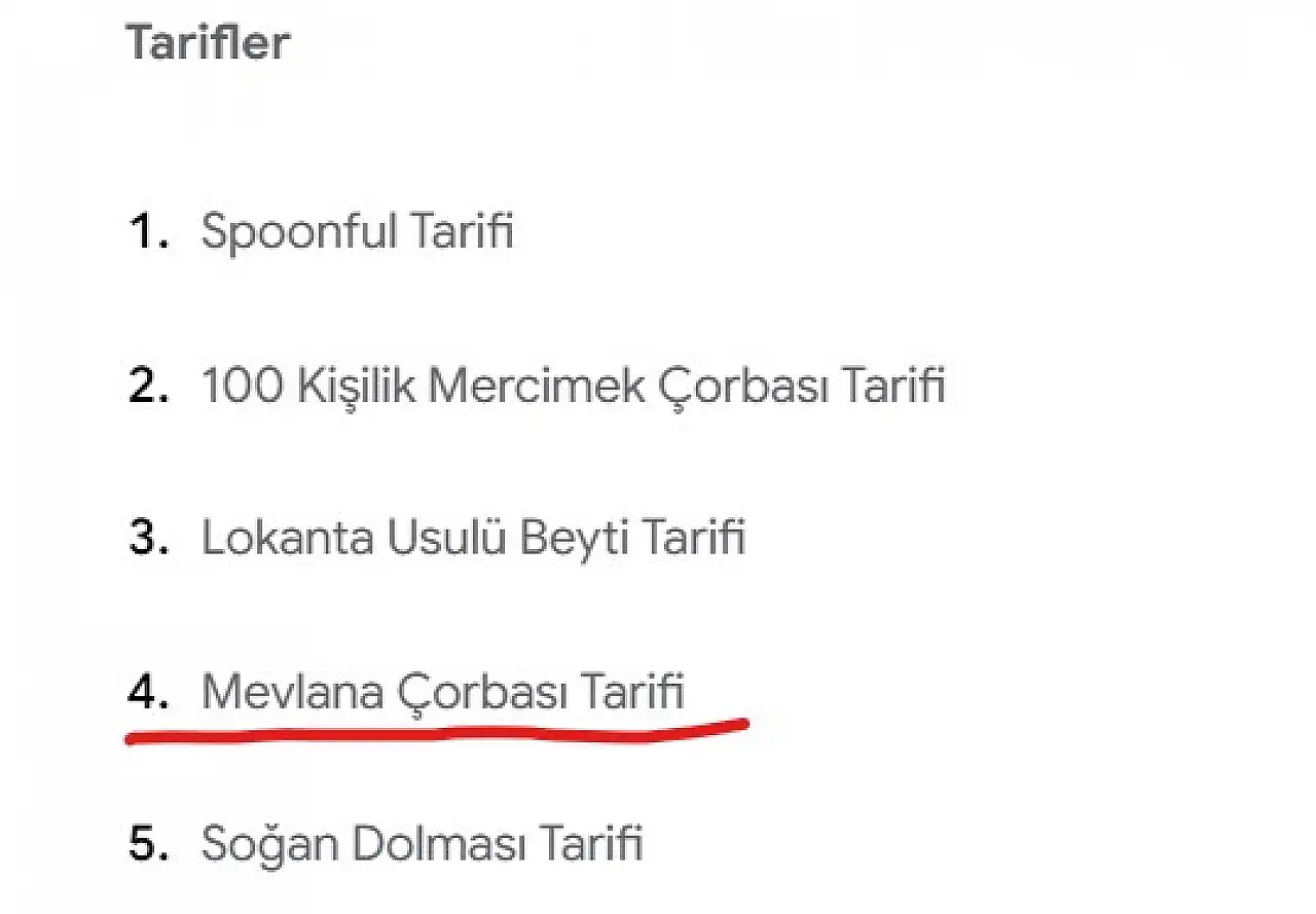 Google, 2025 yılının arama trendlerini paylaştı. Dünya genelinde ve Türkiye özelinde yükselişe geçen arama listelerinde özellikle tarifler dikkat çekti. İlginç olan ise Mevlana Çorbası’nın en çok aranan tarifler arasında yer almasıydı. Ancak yapılan araştırmalarda, Google’da böyle bir çorba tarifine ulaşılamıyor.