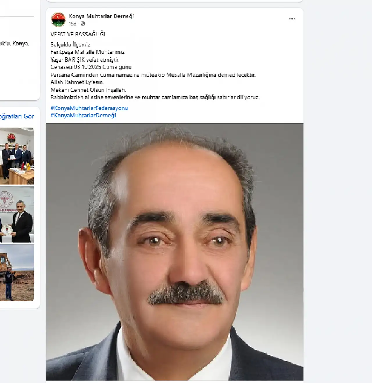 Konya Muhtarlar Derneği'nin paylaştığı bilgilere göre, Selçuklu ilçesi Feritpaşa Mahallesi Muhtarı Yaşar Barışık'ın hayatını kaybettiği aktarıldı.