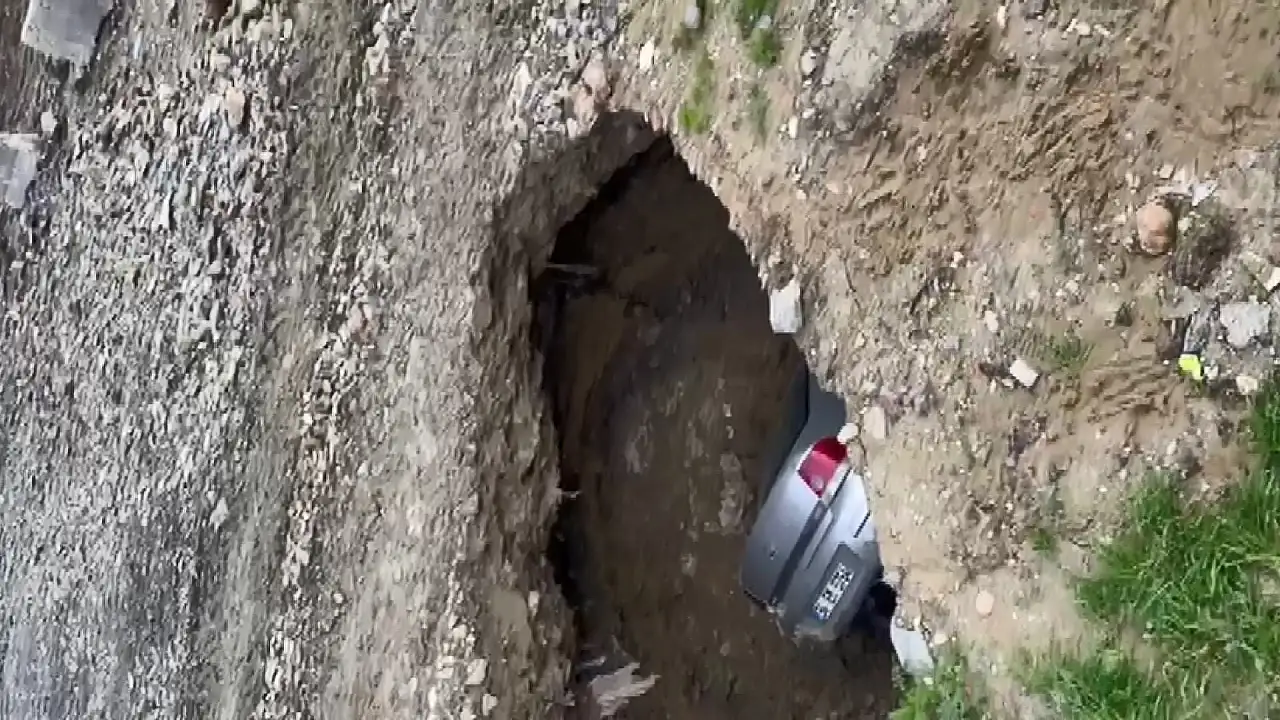 Esenyurt'ta boş arazide oluşan dev göçük, bir otomobili yuttu. Çukurun Konya'daki obruklar gibi sürekli genişlediğini söyleyen mahalle sakinleri panik yaşarken, araç sahibi 'Zaten çok çektim, gömün gitsin' diyerek şaşırttı.