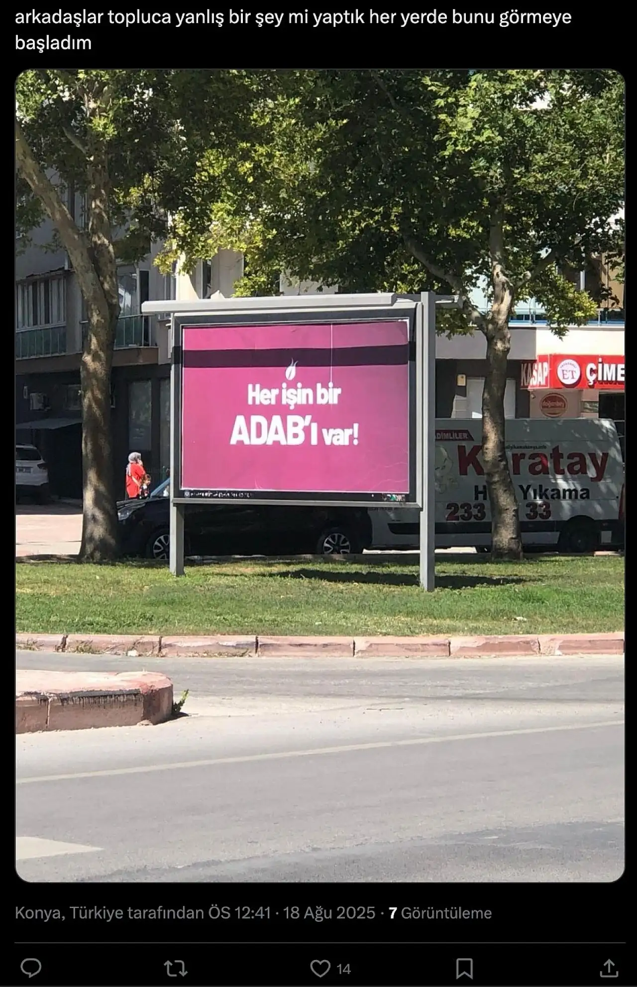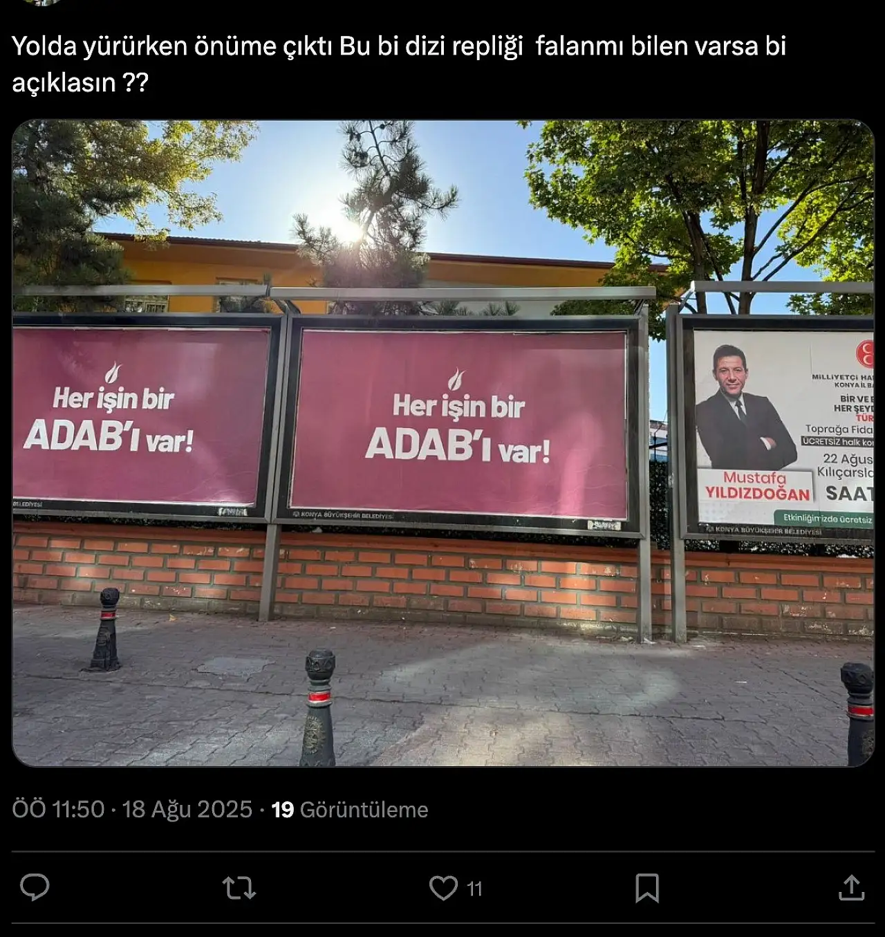 Konya’da son günlerde dikkat çeken ve şehrin farklı noktalarında aynı cümleyle karşılaşılan cümle dikkat çekti: “Her işin bir ADAB’ı var!” Kim tarafından verildiği belli olmayan bu reklam çalışması, vatandaşların merak konusu oldu.