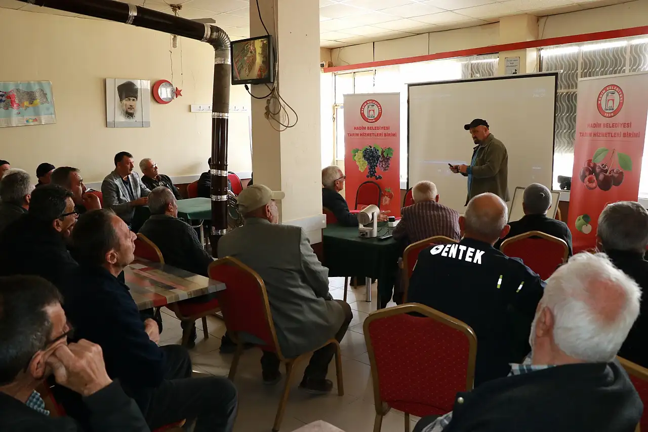 Hadim Belediyesi, 'Bilgi Buluşmaları' kapsamında Bademli'de üreticilerle bir araya geldi. Meyvecilikte doğru ilaçlama, budama ve bakım yöntemleri üreticilere detaylı olarak anlatıldı.