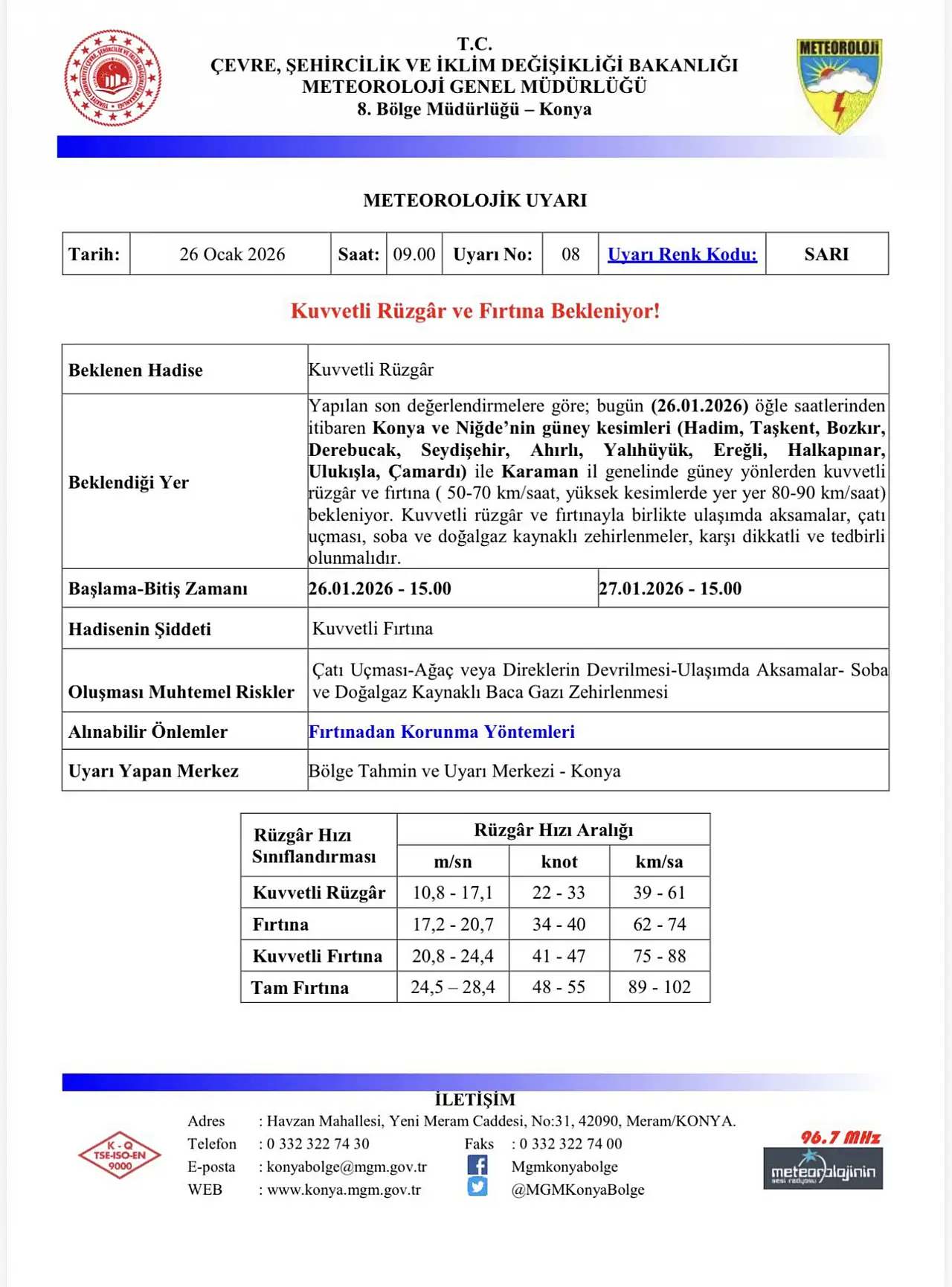 Meteoroloji 8. Bölge Müdürlüğü’nün son değerlendirmesine göre, 26 Ocak Pazartesi günü öğle saatlerinden itibaren Konya’nın güney kesimleri başta olmak üzere Hadim, Taşkent, Bozkır, Derebucak, Seydişehir, Ahırlı, Yalıhüyük, Halkapınar ve Ereğli ilçelerinde kuvvetli rüzgar ve yer yer fırtına bekleniyor. Rüzgar hızının 50-70 km/saat seviyelerine ulaşabileceği, yüksek kesimlerde ise 80-90 km/saat’i bulabileceği ifade edildi.