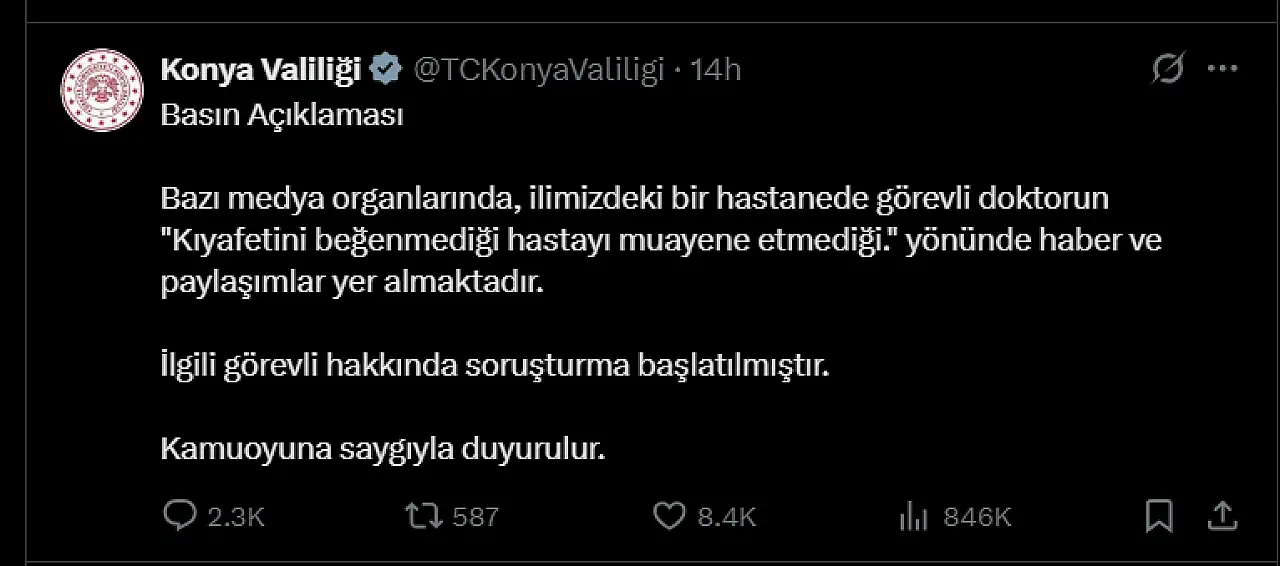 Dün sosyal medya organlarından iddia edilen bilgilere göre, Konya'daki bir devlet hastanesinde muayene olmak isteyen kadın hastanın, doktor H.H.U'nun hakaret niteliğindeki sözleriyle karşı karşıya kaldığı ve H.U'nun 'kendini teşhir etmeyen çıplakları muayene ediyoruz' diyerek hastayı odadan kovduğu öne sürülmüştü. İddialar, sonrası açıklama yapan Konya Valiliği, görevli doktor hakkında soruşturma başlatıldığını duyurdu.