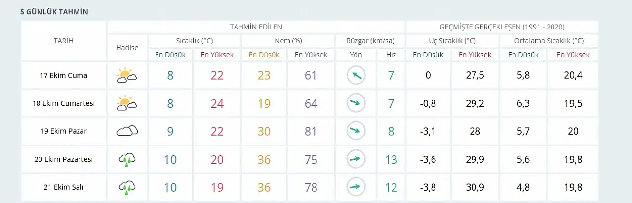 Cuma ve Cumartesi günleri hava parçalı bulutlu olacak. Günlük en yüksek sıcaklık 22–24 derece, en düşük sıcaklık ise 8 derece civarında. Rüzgarlar genellikle hafif. Nem oranı düşük, bu da gün içinde daha ferah ve açık hava koşulları sağlayacak.