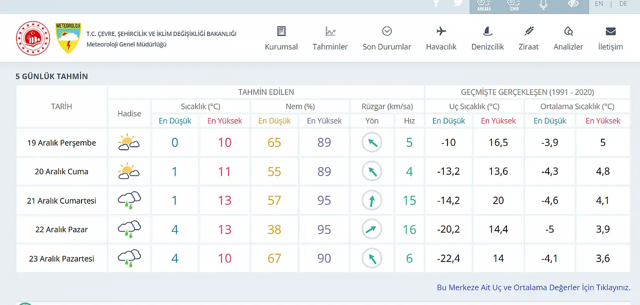 19 Aralık Perşembe Parçalı Bulutlu 0 1020 Aralık Cuma Parçalı Bulutlu 1 11