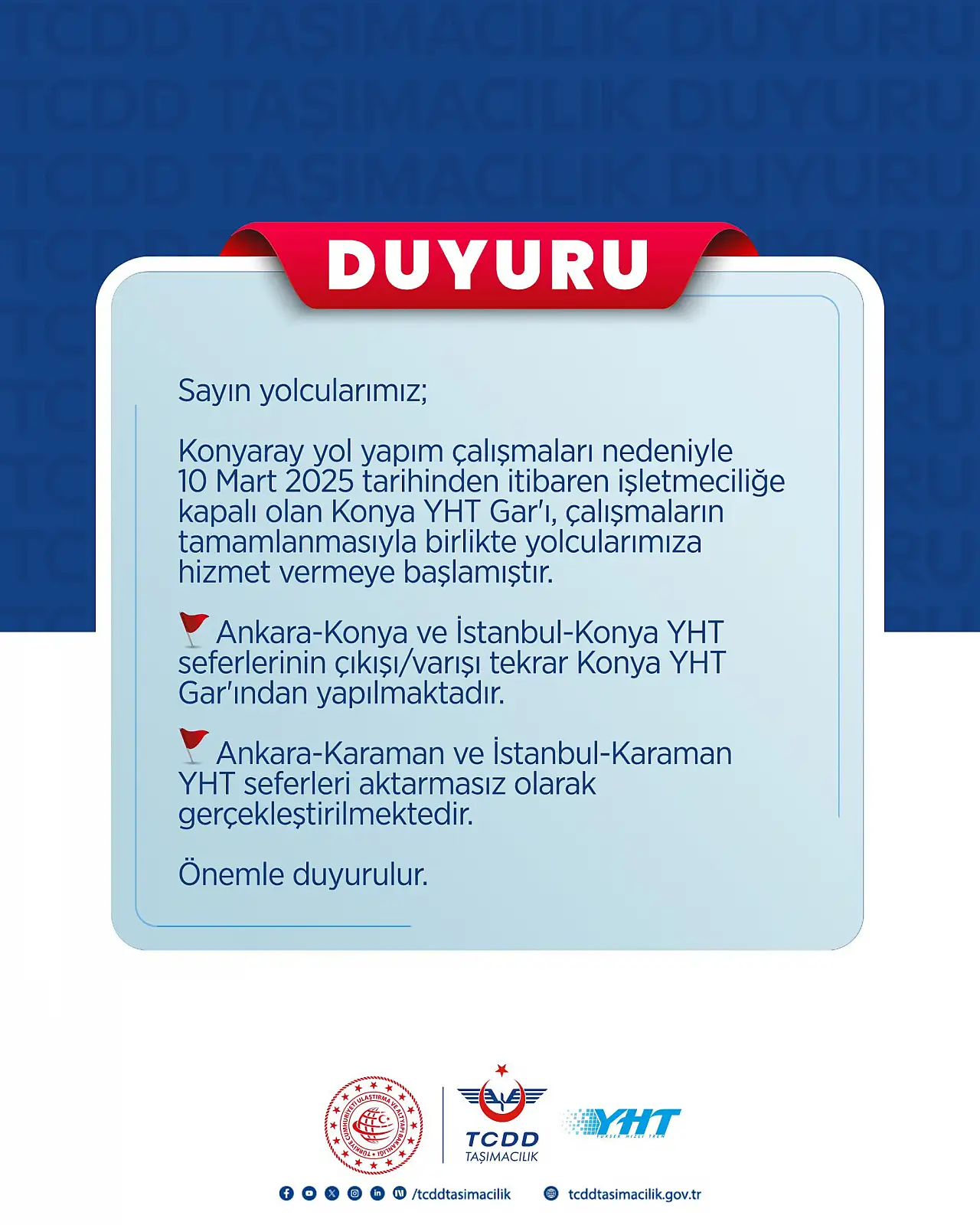 Bir başka önemli duyuru ise, Karaman YHT seferleriyle ilgili oldu. TCDD, artık Ankara-Karaman ve İstanbul-Karaman YHT seferlerinin aktarmasız yapılacağını açıkladı. Bu sayede, yolcular daha hızlı ve konforlu bir şekilde Karaman’a ulaşabilecek.