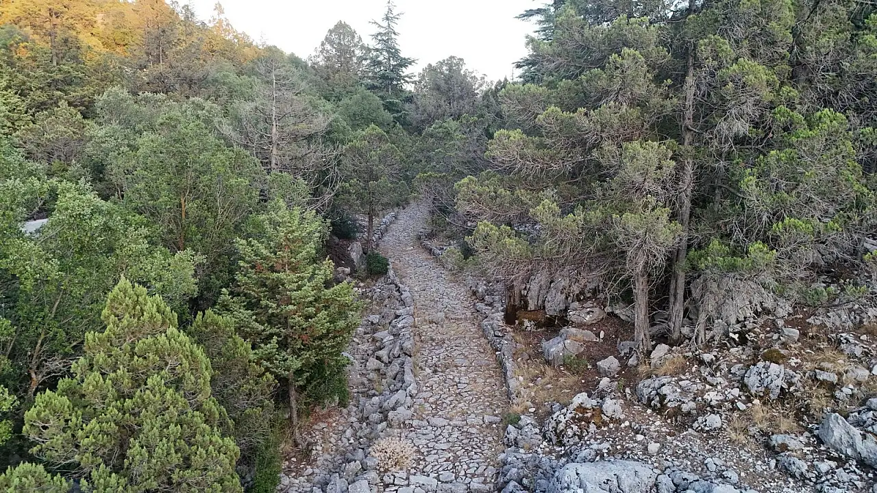 Antik taş yolun kıvrımları, su sarnıçları ve kervanların konakladıkları han kalıntıları tüm detaylarıyla dron ile görüntülendi.