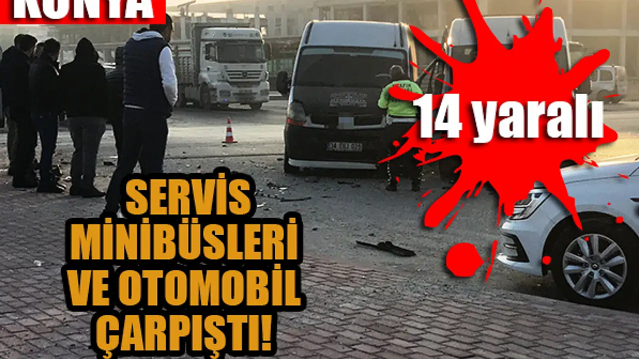 Konya'da, işçi servis minibüsünün aynı yönde seyir halinde olan otomobil ve başka bir servis minibüsüyle çarpışması sonucu 14 kişi yaralandı.
