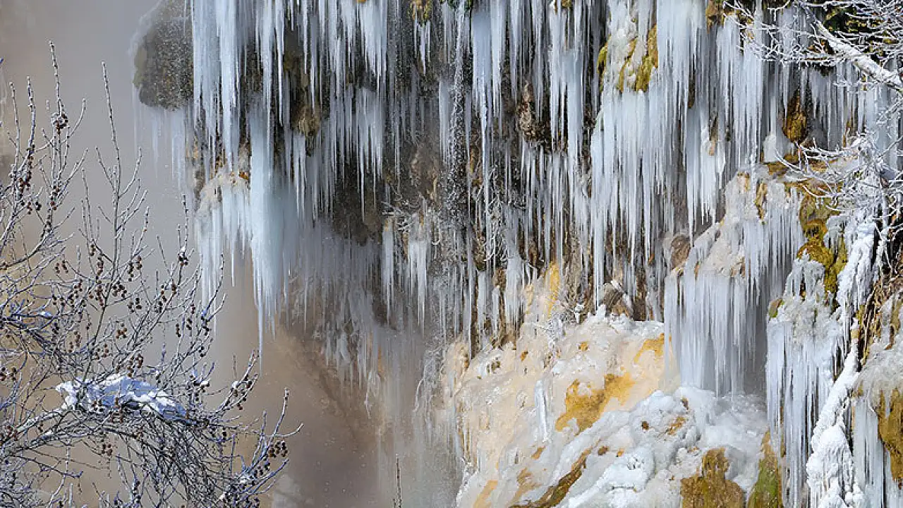 Hava sıcaklığının mevsim normallerinin altında seyretmesi nedeniyle şelalede oluşan buz sarkıtları ve su buharı görsel şölen sunuyor.