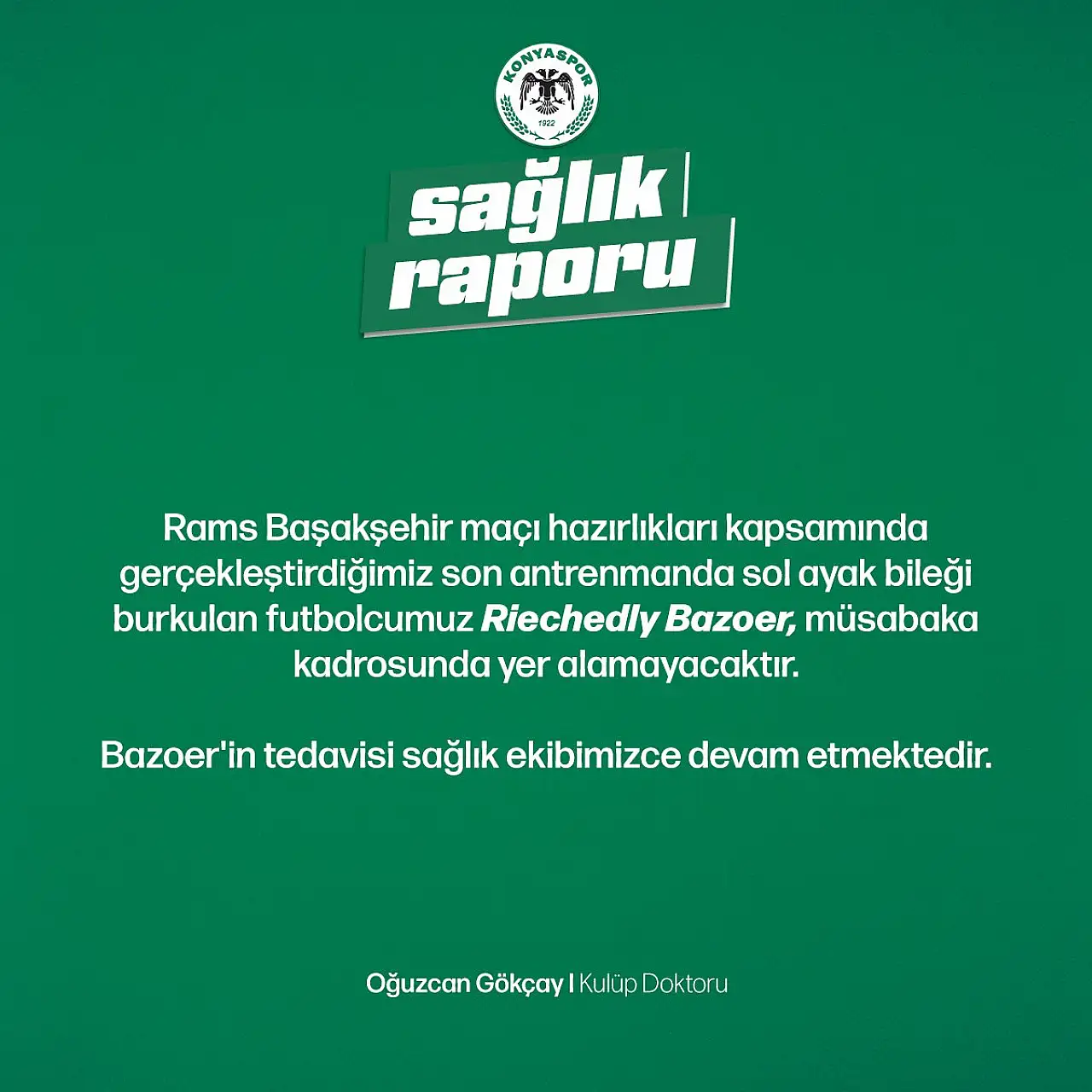 Tümosan Konyaspor, Trendyol Süper Lig’in 7. haftasında bugün saat 17.00'de Rams Başakşehir'i konuk edecek. Maça son bir saat kalırken, Kulüp Doktoru Oğuzcan Gökçay’ın açıklamasına göre, Riechedly Bazoer’un maçta forma giymeyeceği belirtildi.
