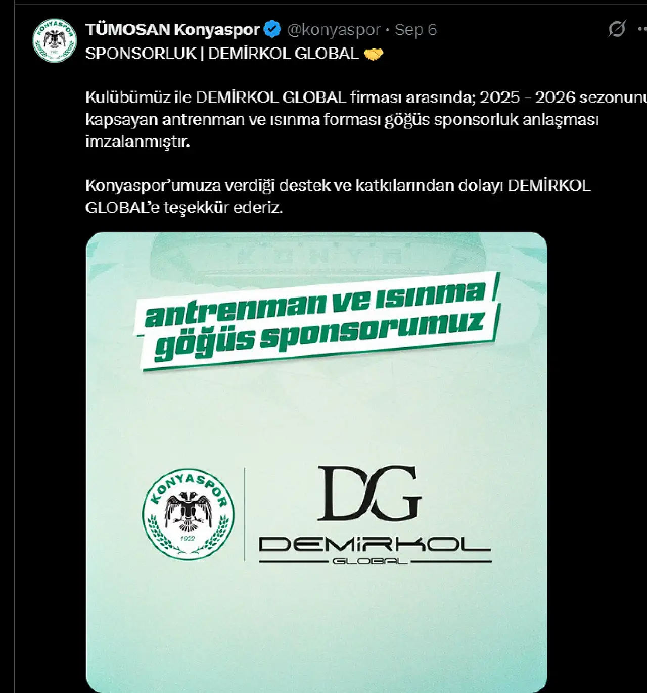 Kulüpten yapılan açıklamada şu ifadelere yer verildi: "Konyaspor’umuz ile DEMİRKOL GLOBAL firması arasında; 2025-2026 sezonunu kapsayan antrenman ve ısınma forması göğüs sponsorluk anlaşması imzalanmıştır. Konyaspor’umuza verdiği destek ve katkılarından dolayı DEMİRKOL GLOBAL’e teşekkür ederiz."