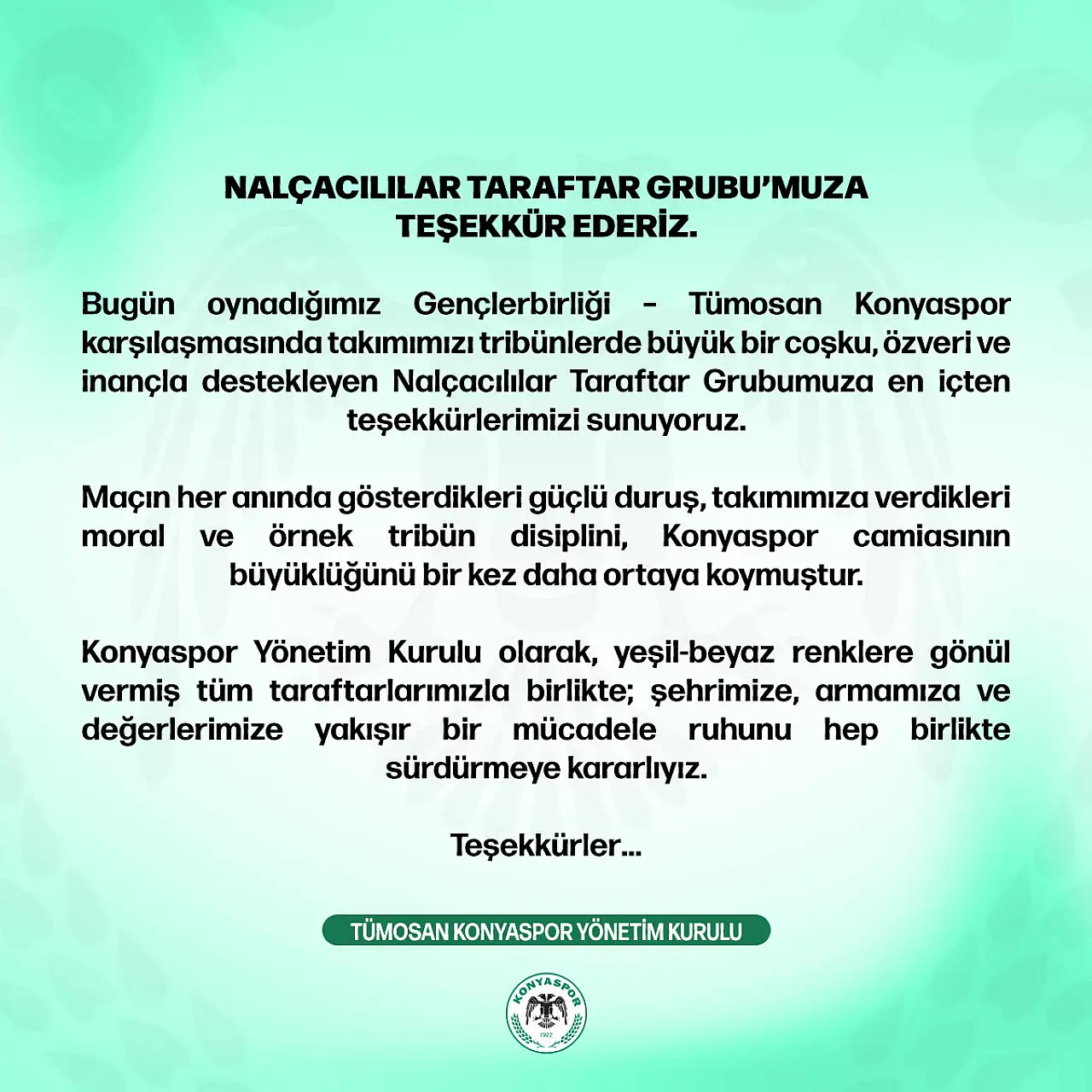 Kulüp yönetimi, yaptığı açıklamada Gençlerbirliği deplasmanında takımı coşkuyla destekleyen Nalçacılar grubuna teşekkür ederek, “Maçın her anında gösterdikleri güçlü duruş, takımımıza verdikleri moral ve örnek tribün disiplini, Konyaspor camiasının büyüklüğünü bir kez daha ortaya koymuştur.” ifadelerine yer verdi. Ancak bu paylaşım, kısa sürede sosyal medyada gündem oldu.