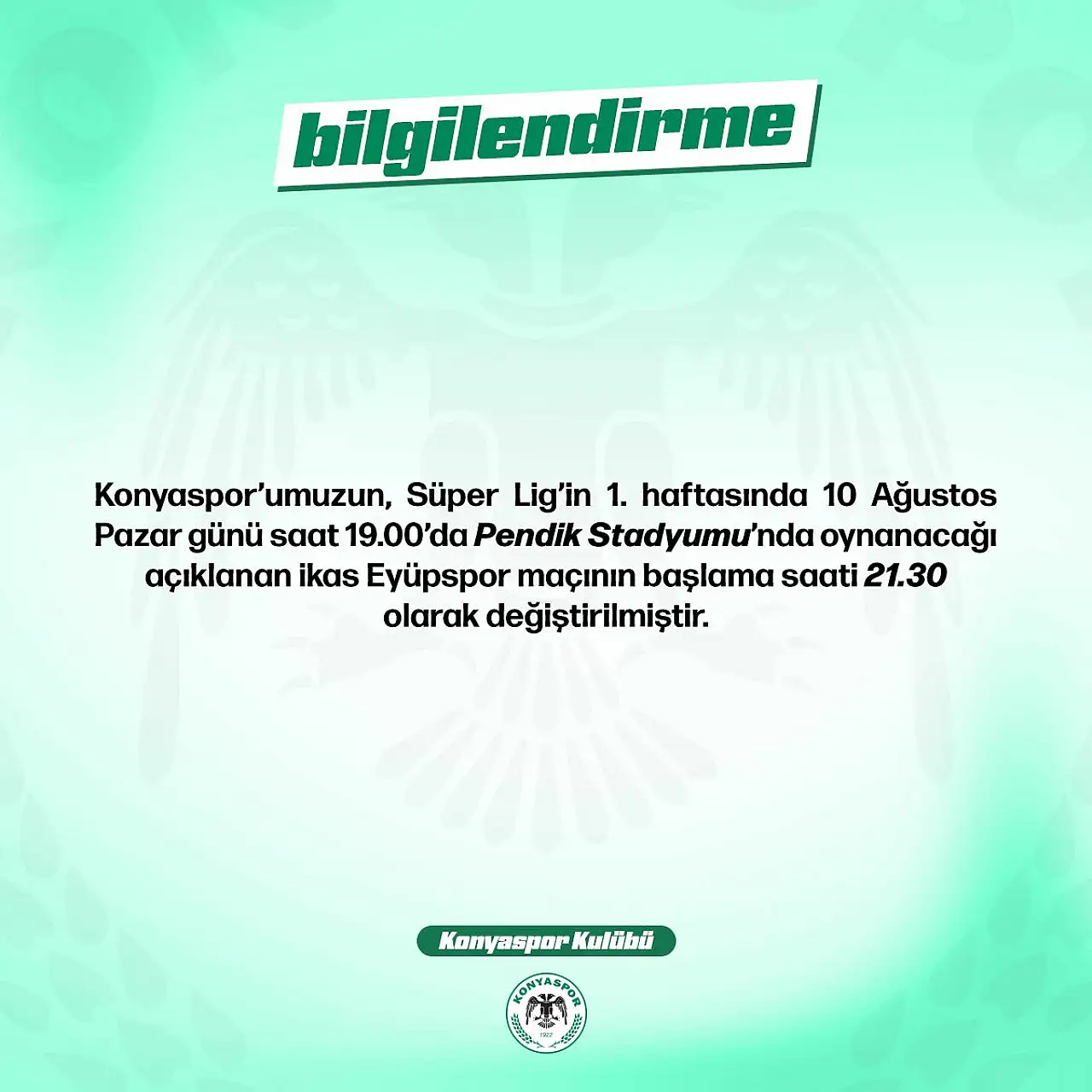 Konyaspor’dan yapılan açıklamada, “Süper Lig’in 1. haftasında 10 Ağustos Pazar günü saat 19.00’da Pendik Stadyumu’nda oynanacağı açıklanan Eyüpspor maçımızın başlama saati 21.30 olarak değiştirilmiştir.” ifadelerine yer verildi.