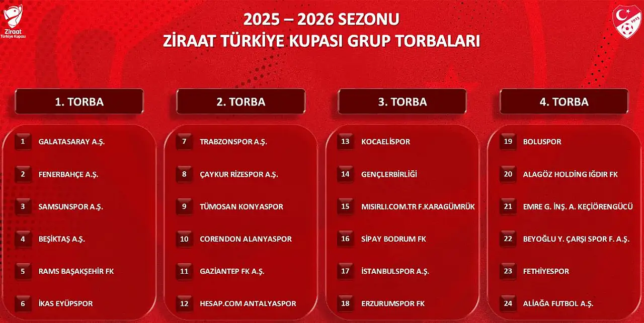Ziraat Türkiye Kupası Grup Müsabakaları Kura Çekimi bugün ( 5 Aralık 2025) saat 15.00'te kulüp yetkililerinin katılımı ile TFF Hasan Doğan Millî Takımlar Kamp ve Eğitim Tesisleri'nde gerçekleştirilecek.